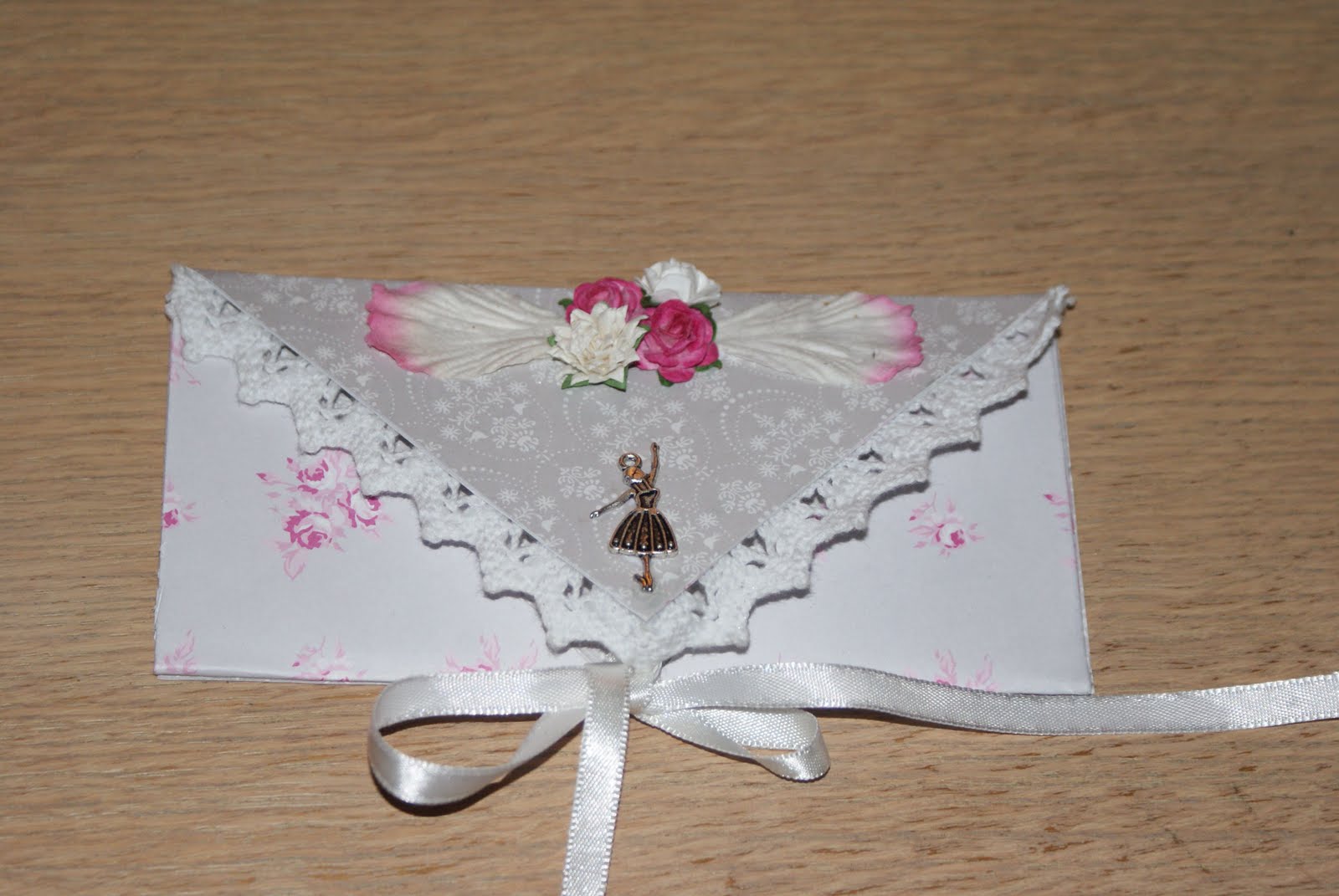 I did put an rectangular back on the envelope (doesn't shows here). Then I started to decorate it a little bit and put some ties in the bottom so I can hold it togheter.