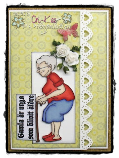 We are getting older every year, whether we like it or not! On this card I have used the new lady stamp, gumma. I have also used the text stamp, old is young who have grown older, gamla är unga som blivit äldre. The lady is colored with pro markers.